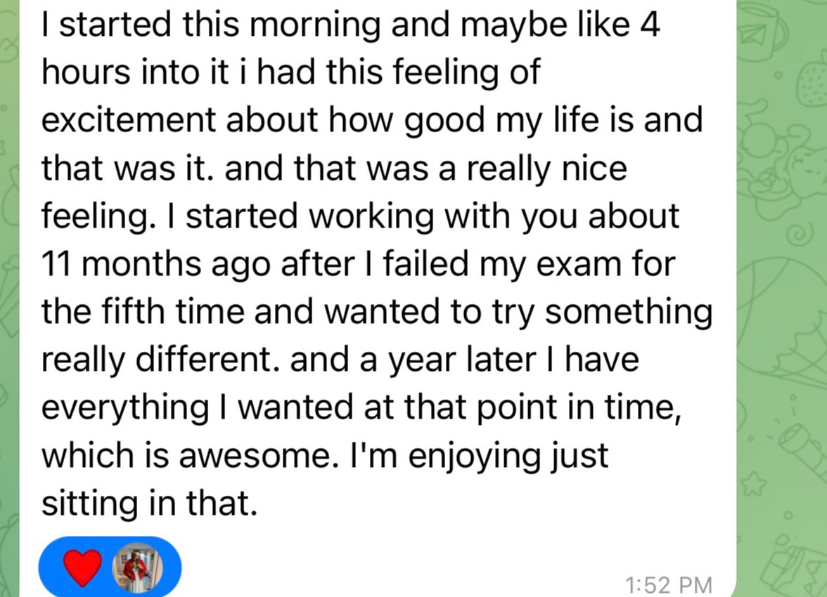 "I went from spinning my wheels and feeling stuck to trusting myself, showing up with confidence, and actually living the way I always knew I could. This shit works."